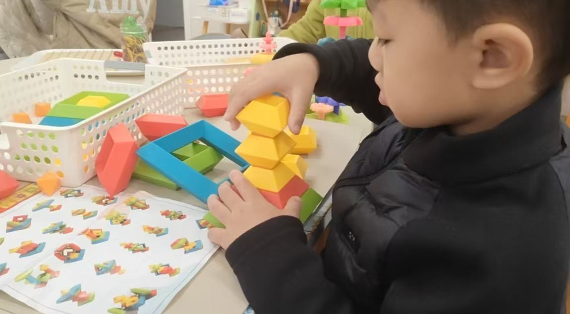 区域活动时间,教室化身为一个充满诱惑的“探索工坊”。我们实习生化身“影子观察员”,沉入各个区域,用笔和镜头记录下幼儿最本真的游戏状态。在建构区,孩子们是天生的建筑师,他们为“小动物”搭建能遮风挡雨的家,在积木的垒高、围合与倒塌中,初步感知着物理的平衡与空间的结构;在美工区,他们是色彩的魔法师,稚嫩的小手紧握画笔,将天马行空的想象挥洒于画纸,每一抹色彩、每一个不成形的图案,都是其内心世界的独特表达;在益智区,他们又是专注的思考者,神情严肃地匹配着形状,在不断的试错中解锁新的规律。我们屏息凝神,努力读懂其行为背后的思维逻辑与发展水平,深刻体会到“观察是理解的起点”。