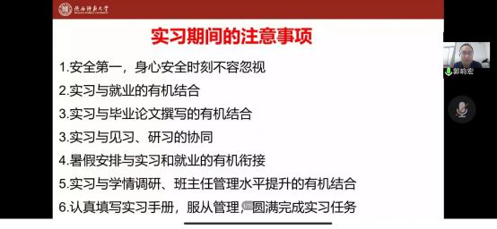 郭响宏首先强调了教育实习在师范生教育培养体系中的重要意义,期望大家以此为契机,积极提升自身教学能力、扎实做好学情调研、主动提高班级管理水平,努力为毕业论文撰写做好充分准备;其次,他希望同学们从现在开始,合理安排暑假规划,做好教育实习与就业的衔接工作,及早明确就业方向,在实习的同时抓住可能的机会,与适合自身的工作单位签约。