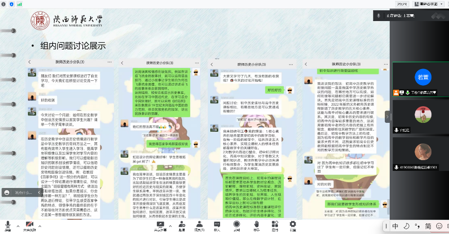 组长就本次新课标的学习过程进行回顾,小组成员依次发言,分享个人的学习情况和感想,接着,据前期确定的几个关键问题进行进一步的深入交流讨论。小组全体成员共同观看东北师范大学历史文化学院张卓鸿教授的《义务教育历史课程标准》研读课程,各成员就其观看感受发表看法。小组组长王若萱总结发言,对小组的这次新课标学习进行了高度肯定,并再次强调了学习新课标的重要性,提到希望大家会后能对此次的学习内容进行整理,再次深入理解新课标的要求,为实习做好准备。