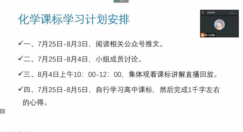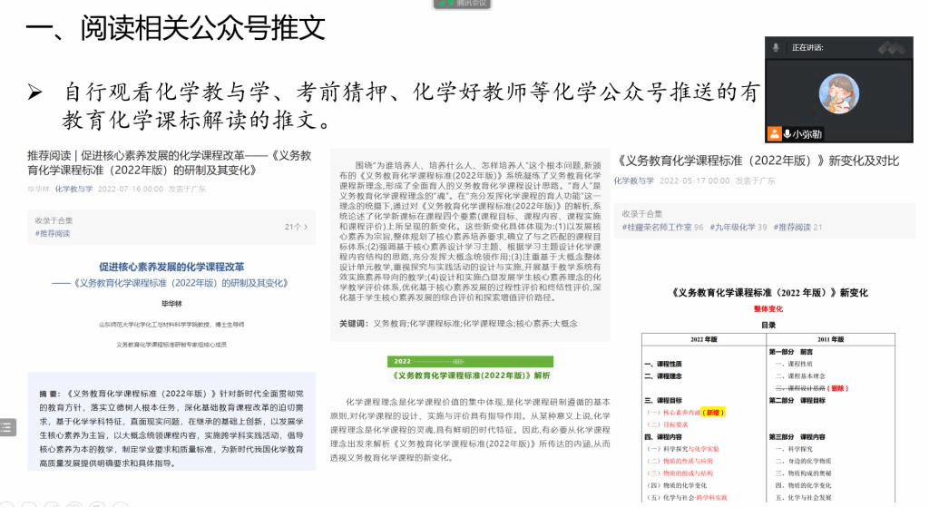 在本次会议中,化学组首先展示了课标学习计划安排,本次课标学习计划分别是:阅读相关公众号推文,化学组成员参与群内讨论,集体观看义务教育化学新课标编写组组长的课标讲解直播回放以及自行学习高中化学课标。